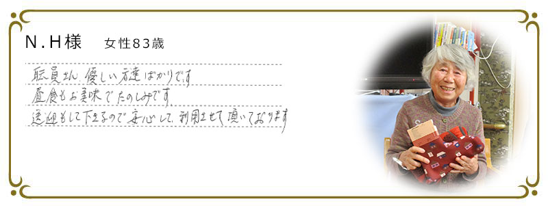 - ご自宅へ送迎専用車でお迎えにまいります。元気にお会いできて、うれしい瞬間です。