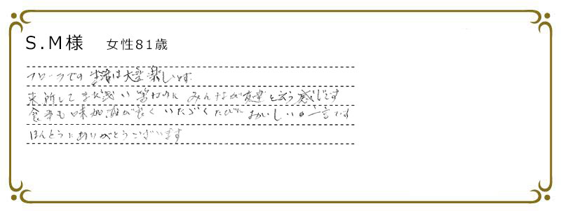 - フローラ蓮田は、おもてなしの気持ちを忘れることなく、心の通ったケアで皆様をお支えいたします。