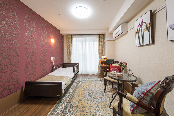 介護用3モーター電動ベッド・羽毛布団等寝具一式・ナースコール(2カ所)・クローゼット・温水洗浄機能付トイレ・車椅子対応洗面台・エアコン・照明器具・カーテン・電話回線・インターネット回線・テレビ回線・センサー付夜間フットライト・車椅子対応キッチン(スイート居室のみ)